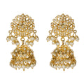 Introducing Auric Dusk, an exquisite pair of jadau jhumkas plated in radiant 22-karat gold and delicately accented with lustrous pearl drops. Crafted in the timeless jhumka silhouette—a classic Indian bell-shape with roots dating back to the Mughal era—these earrings blend heritage with modern elegance . Each piece is painstakingly set with traditional jadau and kundan work atop a durable alloy base, then finished with thick, gleaming gold plating that evokes the warm glow of twilight.