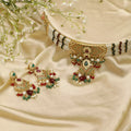At the heart of this design lies the harmonious fusion of luminous pearls, vibrant rubies, and emeralds—each element chosen not just for its beauty, but for its symbolism. The pearls, with their soft, glowing sheen, reflect purity and sophistication. Meanwhile, the rubies and emeralds add a burst of color, representing passion, prosperity, and vitality. Each gemstone is intricately set into the choker, highlighting the skilled craftsmanship that defines Jadau artistry.