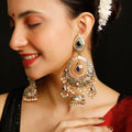 Embrace the timeless elegance and vibrant charm of our Dark Turquoise, Emerald, and Pearl Stone-Studded Chaanbalis, masterfully crafted with gleaming 22-karat gold plating. These large, ornate earrings are designed to dangle gracefully, making them a perfect statement piece that captures the essence of traditional Indian artistry infused with contemporary allure.