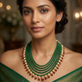 An ode to timeless elegance with a refreshing touch of nature, the Green Pearl Drop Necklace is crafted for those who appreciate subtle luxury with a distinctive presence. Designed with multiple strands of rich green semi-precious beads, this necklace exudes a sense of calm sophistication and graceful charm. The deep green tones symbolize renewal, prosperity, and harmony, making it a perfect choice for both festive and celebratory occasions.