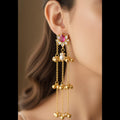 The highlight of the Imperial Kaan Jadau is the long kaan chain, designed to drape elegantly along the ear, creating a graceful and royal silhouette. Delicate pearls cascade from the earrings, adding subtle movement and shimmer, enhancing the luxurious appeal. The harmonious blend of lustrous pearls, glittering Jadau stones, and warm gold tones makes these earrings a statement piece that exudes opulence and timeless elegance.