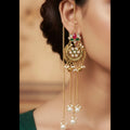 The standout feature of these earrings is the long kaan chain, designed to drape gracefully along the ear, creating a unique and luxurious look. Delicate pearls hang elegantly from the base, adding movement and a soft shimmer that enhances the overall design. The combination of glistening Jadau stones and lustrous pearls makes these earrings a statement piece, perfect for weddings, festivals, and other celebratory occasions.