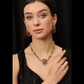 The Ruby Groove Set is a perfect blend of tradition and modernity, crafted with precision and artistry by skilled artisans. The open pendant design accentuates the neckline, adding sophistication and charm, while the matching earrings complete the ensemble with balance and elegance. Lightweight yet durable, this set offers comfortable wear throughout weddings, festive occasions, and grand celebrations, while the secure stone settings ensure that the diamonds and red gemstones retain their brilliance for years to come. Its intricate detailing reflects the finesse of heritage-inspired jewellery, while the lively design adds a youthful, energetic vibe, making it ideal for women who love statement-making accessories that stand out in every gathering.
